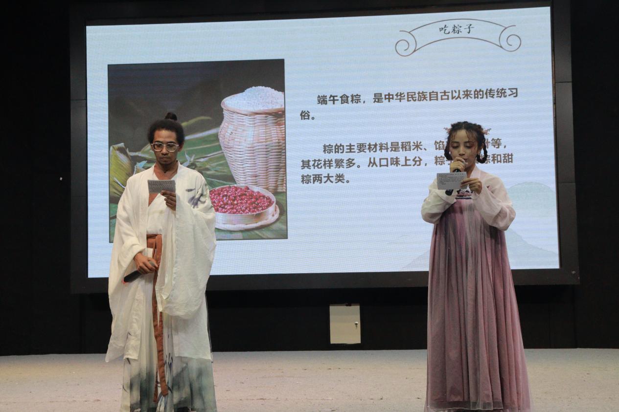 馬達(dá)加斯加的留學(xué)生劉晨和文彬合唱暖場(chǎng)歌曲《黑月光》,分享端午節(jié)的來(lái)源與習(xí)俗。