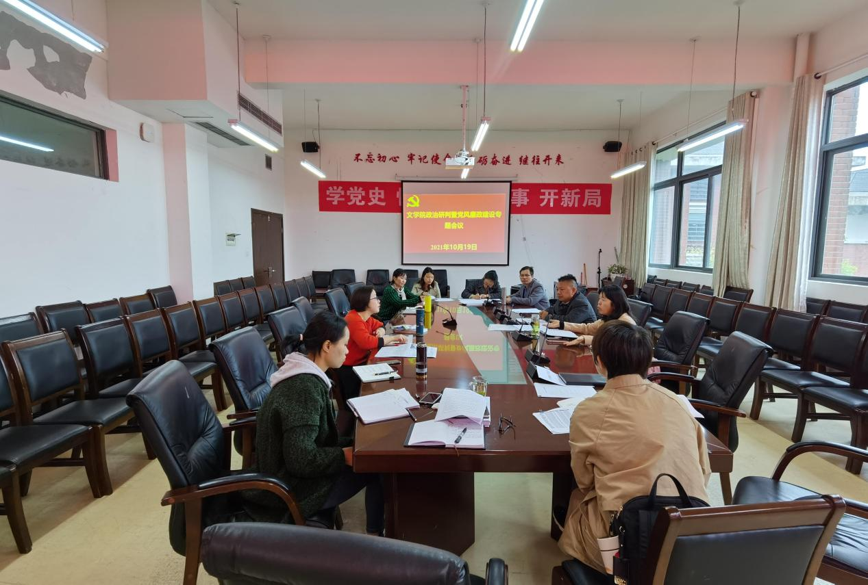 10月19日下午,文學院召開政治研判暨黨風廉政建設專題會議,深入貫徹落實十九屆中央紀委五次全會精神和十二屆省紀委五次全會精神,安排部署我院深化全面從嚴治黨要求特別是黨風廉政建設工作。院黨委副書記楊經華(主持工作)出席并主持會議,院黨委副書記文靜出席,各黨支部書記、各科室和各系負責人參加。