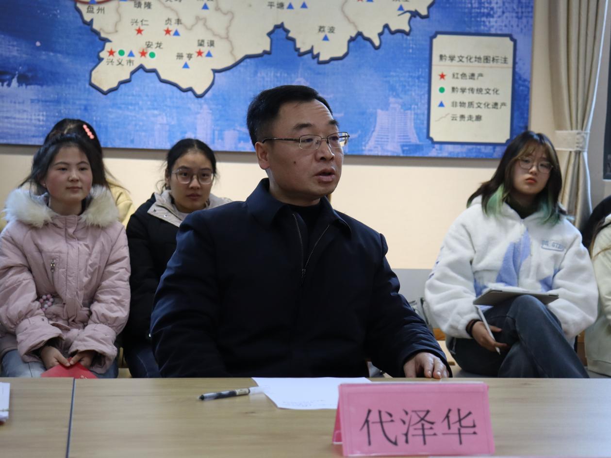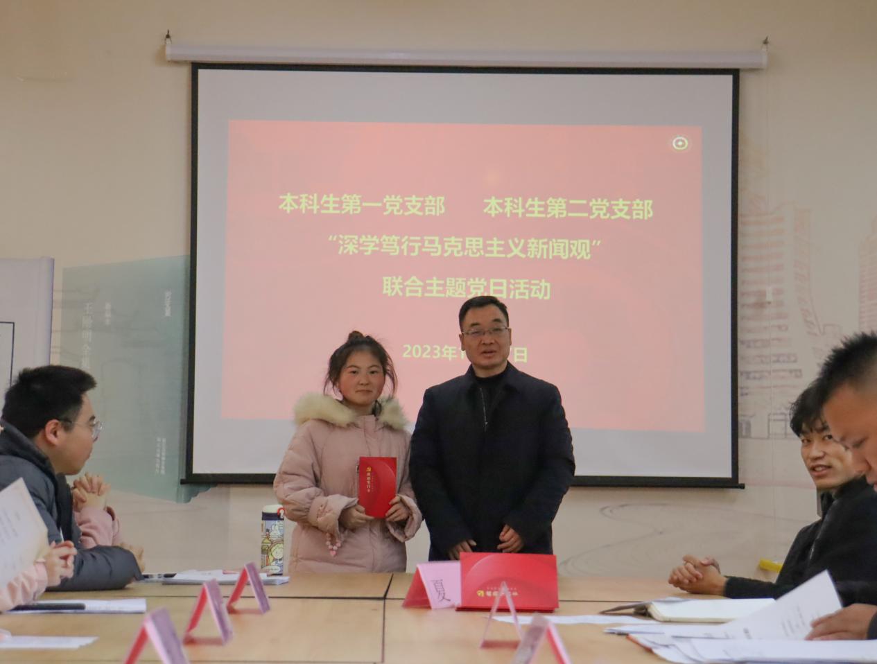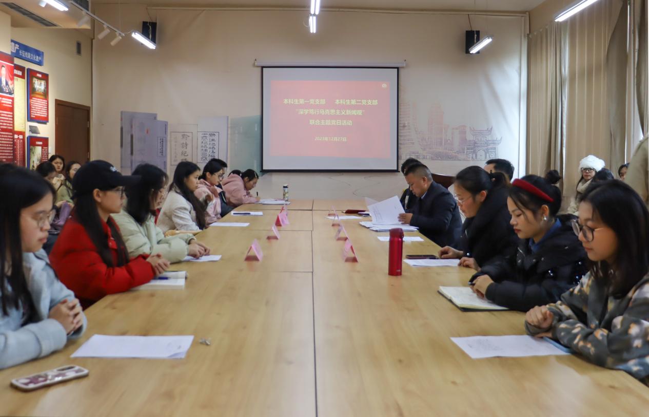 12月27日,文學院本科生第一黨支部、第二黨支部在文德樓黔學館聯(lián)合開展“深學篤行馬克思主義新聞觀”主題黨日活動。院黨委書記楊經華,院黨委副書記、紀委書記(兼)代澤華出席并指導工作。本科生第一黨支部、第二黨支部黨員60余人參加。本科生第二黨支部書記夏梅主持。