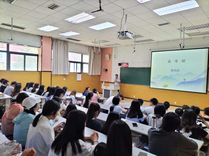 陳為兵老師以“說考研”為主題,拉開了本期沙龍活動的序幕。首先,陳老師對“為什么考研”這一問題,從“為研而考”和“非研而考”兩方面來強調(diào)考研對于學生成長發(fā)展的重要性。陳老師指出,學生可以通過考研來磨煉自己,為自身以后的發(fā)展打下堅實的基礎(chǔ)。其次,陳老師指出學生在學習過程中“做姿要正”,學習好的同時也需要注重加強體育鍛煉,做到勞逸結(jié)合。