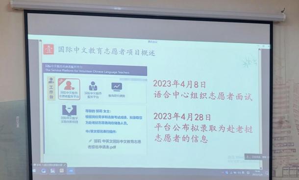 會(huì)上,郭莉以自身赴老撾作志愿者的經(jīng)驗(yàn)為例,分別從國(guó)際中文志愿者概述、崗前培訓(xùn)、相關(guān)證件和手續(xù)辦理等方面詳細(xì)地介紹了國(guó)際中文志愿者崗位的變化、面試注意事項(xiàng)、擬錄取流程培訓(xùn)時(shí)間及內(nèi)容、考核要求等內(nèi)容。