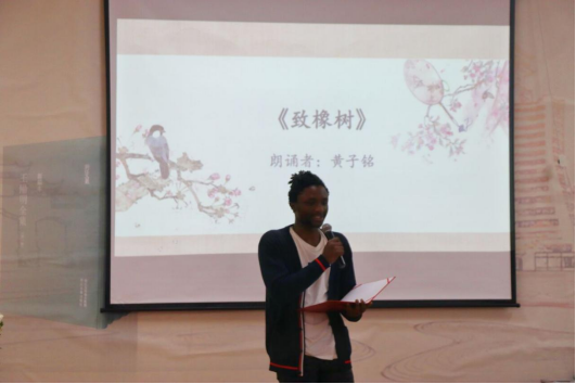 研究生會蘆葦沙龍的同學(xué)們用別具一格的粵語、西南官話交織朗誦了《春江花月夜》,盡展中國地域的方言之美;來自非洲的留學(xué)生誦讀了《致橡樹》《夢》和馬達加斯加詩歌《祈禱》,全場師生品味異域人文風(fēng)情,共享文化交融之美。