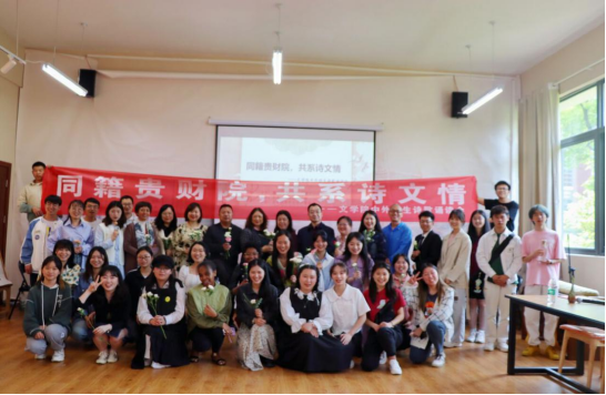 為弘揚中華優(yōu)秀傳統(tǒng)文化,堅定文化自信,厚植家國情懷,2022年4月26日下午,文學(xué)院在文德樓黔學(xué)館舉辦了“同籍貴財大,共系詩文情——中外師生詩歌誦讀會”。國際交流合作處處長王小華,文學(xué)院黨委書記楊經(jīng)華,院長顧雪松,院黨委副書記、紀(jì)委書記(兼)代澤華,院黨委副書記文靜及文學(xué)院師生代表參加。